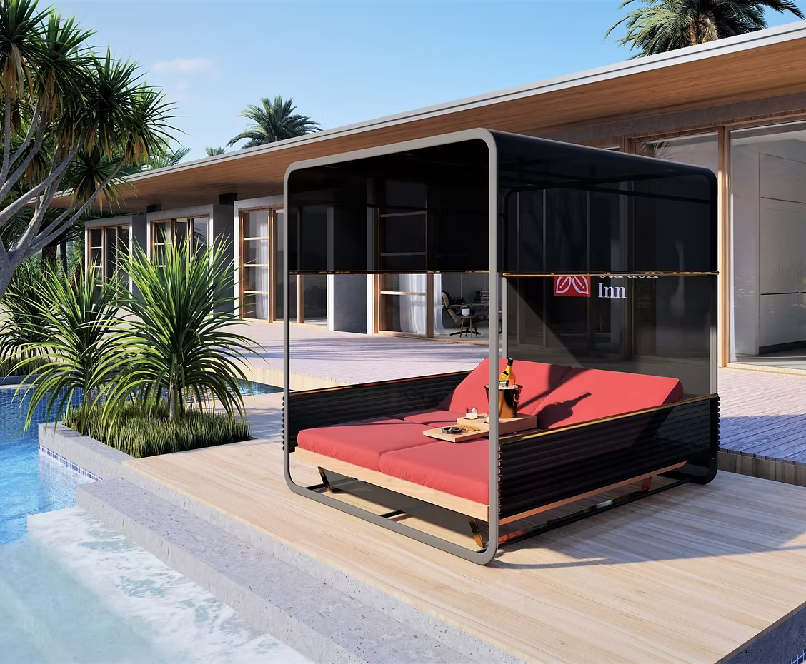 Outdoor-Schutzpaneele aus Stoff oder Aluminium rund um strand lounge bieten Schutz vor äußeren Einflüssen wie Sonne, Wind, Regen, Staub und Lärm.